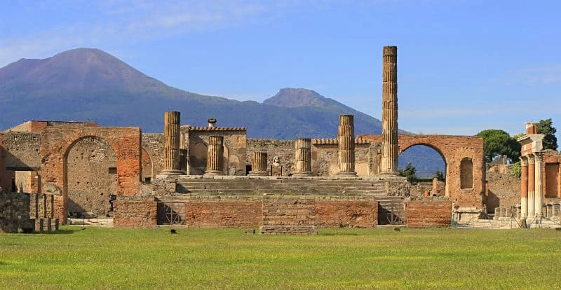 Pompeii - one of the most famous Roman sites in the world. Pompeii was destroyed when Mt Vesuvius erupted in AD 79 and covered the city with ash. Day trips are advertised in Naples city centre but you can travel there by your own steam.